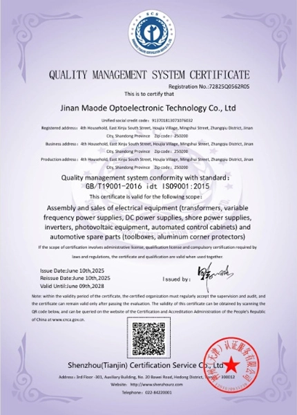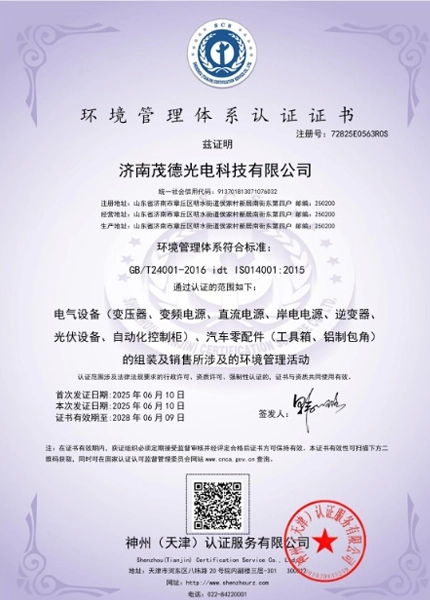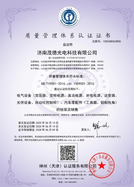 济南茂德光电科技有限公司是一家专业设计研发、生产销售各类军用、工业用和民用高性能交直流电源产品及电力电气系统集成设备的山东省高新技术企业,是国内外一流的电源行业系统解决方案及产品提供商。