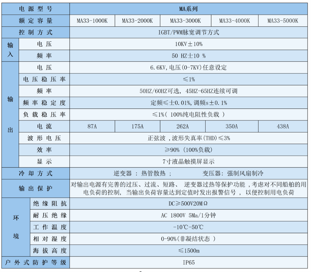 MA系列大功率岸电电源是我公司根据客户需求,专门针对工业环境的高温、高湿、高腐蚀性、大负荷冲击等恶劣使用环境而特别设计制造的大功率60Hz变频电源设备,现有成熟产品最大功率单机可以达到3000KVA。