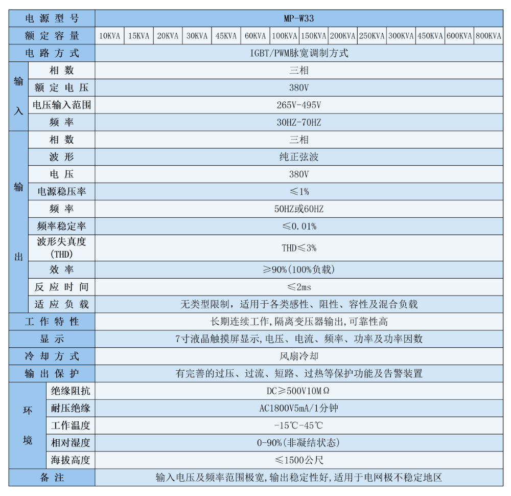 我公司生产的MP-W系列稳压稳频电源专门针对电网供电电压、供电频率均不稳定, 电压严重畸形 ,存在闪变、 跌落等综合性电压质量问题下设计研发的 ,用来保障对电网要求比较高的精密用电设备。
