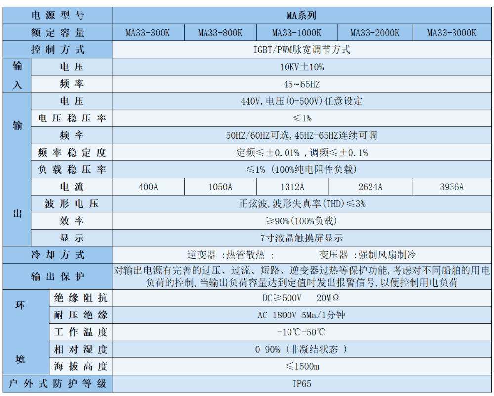 MA系列大功率岸电电源是我公司根据客户需求,专门针对工业环境的高温、高湿、高腐蚀性、大负荷冲击等恶劣使用环境而特别设计制造的大功率60Hz变频电源设备,现有成熟产品最大功率单机可以达到3000KVA