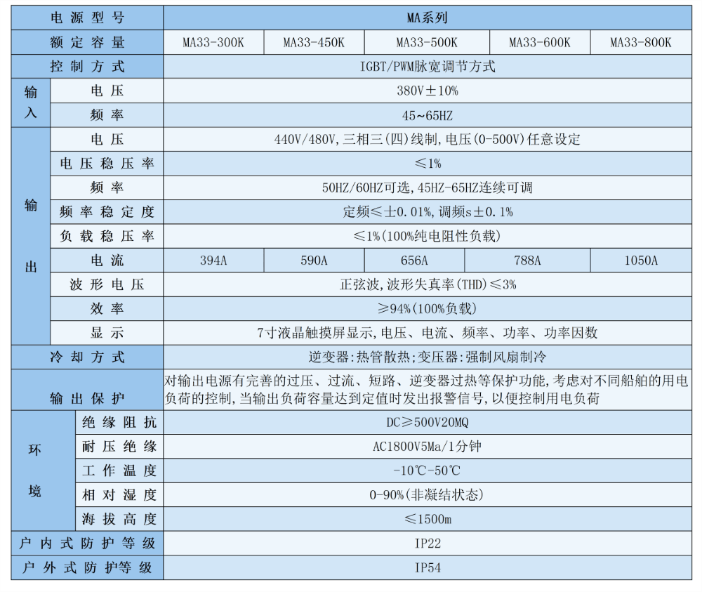 MA系列大功率岸电电源是我公司根据客户需求,专门针对工业环境的高温、高湿、高腐蚀性、大负荷冲击等恶劣使用环境而特别设计制造的大功率60Hz变频电源设备,现有成熟产品最大功率单机可以达到3000KVA。